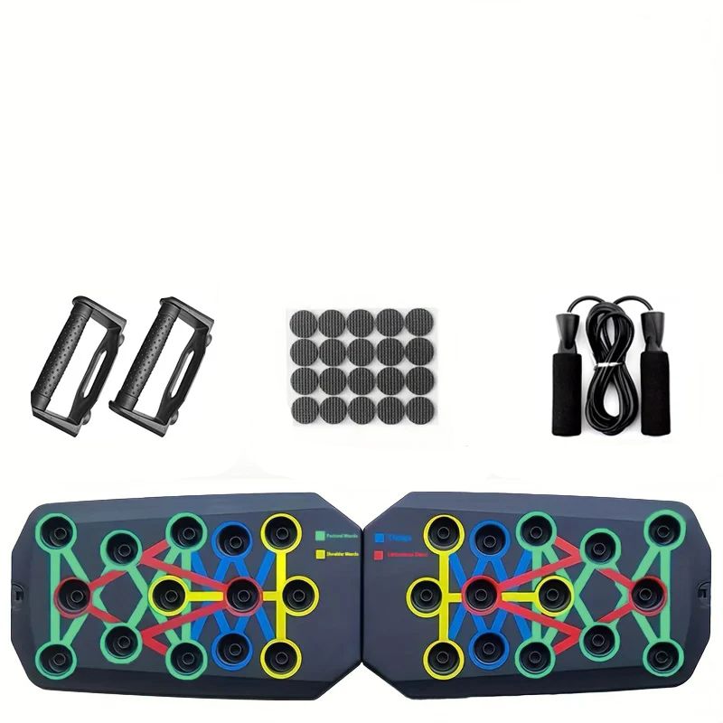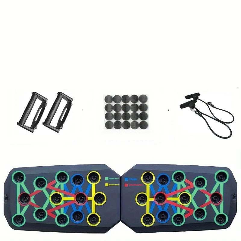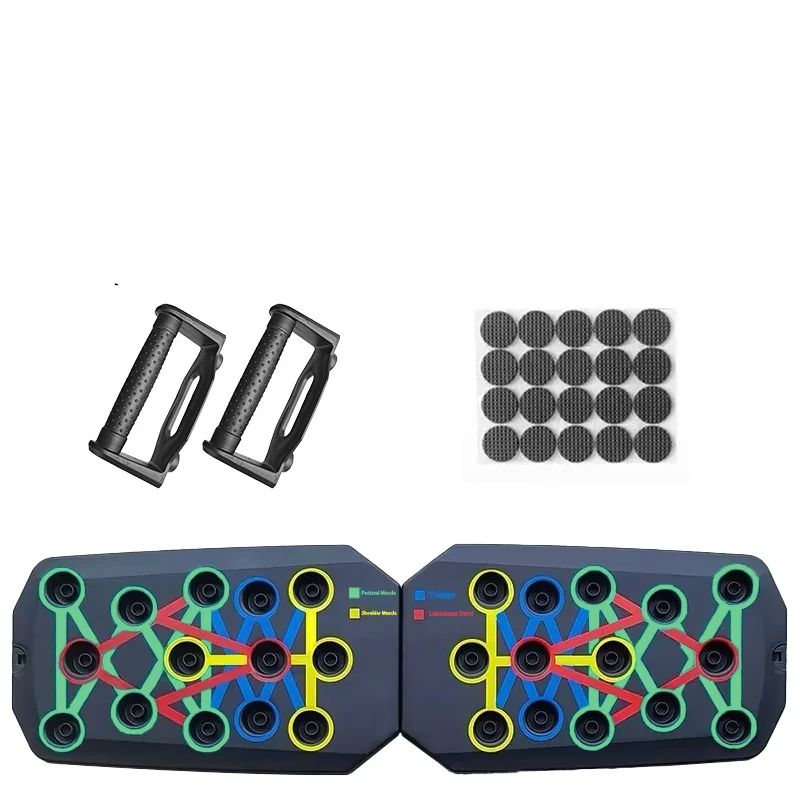 Equipamento versátil para treino de força, projetado para trabalhar diferentes grupos musculares através de encaixes coloridos que indicam a posição correta das mãos. Ideal para exercícios de peito, ombros, tríceps e costas, ajudando a melhorar o desempenho físico e fortalecer a musculatura de forma prática e eficiente.